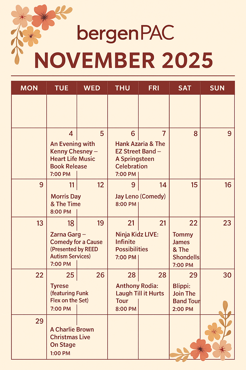 Get ready for another month of incredible performances at BergenPAC! From world-class concerts and captivating theater to family-friendly shows and community events, there’s something for everyone to enjoy. Check out this month’s lineup and make your plans to experience live entertainment at its best.